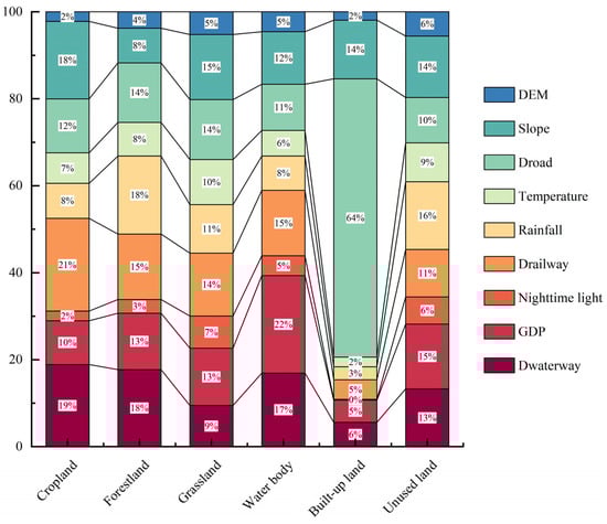 Notably, certain factors exhibited pronounced influence on specific land use types: for cropland, the primary contributors were found to be annual mean temperature, DEM, and GDP; for forestland, significant impacts were attributed to annual mean rainfall, DEM, and annual mean temperature; and grassland was notably affected by GDP, annual mean temperature, and nighttime light. Similarly, water body demonstrated considerable sensitivity to slope, DEM, and annual mean temperature. Furthermore, built-up land showcased a substantial influence from nighttime light, GDP, and DEM, while unused land was notably affected by annual mean rainfall, slope, and GDP. This comparison underscores the significant impact of natural environmental factors on cropland, forestland, water body, and unused land, whereas socio-economic factors exhibited robust correlations with grassland and built-up land. Remarkably, nighttime light emerged as the predominant contributor in built-up land, accounting for over half of the overall impact (Figure 4).