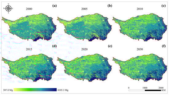 Based on the outcomes derived from the InVEST model, the carbon storage dynamics of the Tibetan Plateau manifested a temporal trajectory characterized by an initial decline followed by a subsequent increase, eventually converging towards a state of relative stability. Overall, there was a discernible decrement in total carbon storage, amounting to approximately 1,503,221,153.67 Mg, spanning the temporal spectrum from 2000 to 2030. Notably, the nadir of carbon storage, approximately 507.75 Mg, was predominantly localized within the southwestern and northern extents of the Tibetan Plateau, encompassing regions such as the northwestern Qinghai Province, western Tibet Autonomous Region, and southern Xinjiang Uygur Autonomous Region, typified by prevalent land use types of water body and unused land. Conversely, the apogee of carbon storage, reaching approximately 4105.30 Mg, predominantly emanated from the southeastern fringes of the Tibetan Plateau, encompassing locales such as the southeastern Qinghai Province, eastern Tibet Autonomous Region, and northern Sichuan Province, characterized by land use types predominantly comprised of forestland and grassland. The conspicuous fluctuations in carbon storage observed during the interval from 2005 to 2010 were primarily ascribed to the extensive conversion of grassland in the Tibet Autonomous Region into water body and unused land, underscored by the substantially higher carbon density inherent in grassland compared to the cumulative density of water body and unused land.