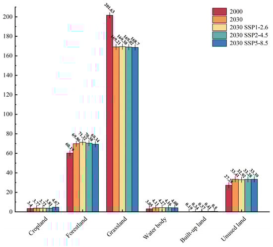 Examining the scenarios projected for 2030, it was discerned that under the SSP1-2.6 scenario, minimal expansion was evident in cropland, built-up land, and unused land, while the SSP5-8.5 scenario exhibited the least extent of forestland, grassland, and water body. Conversely, the SSP1-2.6 scenario demonstrated a pronounced increase in forestland, grassland, and water body, whereas the SSP5-8.5 scenario depicted a substantial expansion in cropland, built-up land, and unused land. This delineated a discernible trend where natural land use types were progressively dwindling while anthropogenic land use types were correspondingly expanding, notably attributable to escalating carbon dioxide emissions. In deviation from conventional trajectories, the SSP1-2.6 scenario notably witnessed a marked augmentation in forestland, grassland, and water body, alongside a gradual ascent in built-up land, predominantly concentrated along the confluence of Qinghai Province, Tibet Autonomous Region, and Xinjiang Uygur Autonomous Region. The salient characteristic of the SSP2-4.5 scenario lied in the marginal increase in cropland and built-up land, juxtaposed with a gradual elevation in forestland and water body, albeit with grassland undergoing a diminishing trend, primarily prevalent in the western fringes of Qinghai Province and the northern precincts of the Tibet Autonomous Region. Conversely, the SSP5-8.5 scenario predominantly manifested a substantial expansion in cropland and built-up land, concomitant with a significant reduction in forestland, grassland, and water body, predominantly distributed across the eastern realms of Qinghai Province, the southern territories of the Tibet Autonomous Region, and the southwestern regions of Gansu Province. These regions undergoing transformation typically exhibited harsher natural environments or heightened population densities, indicative of more pronounced anthropogenic interventions. Overall, the tripartite scenarios exhibited distinct advantages and disadvantages: the SSP1-2.6 scenario emerged as a protracted aspiration, emphasizing augmented anthropogenic land utilization while safeguarding natural land; the SSP2-4.5 scenario was envisioned as a provisional ambition, accentuating heightened anthropogenic land utilization while compromising only select portions of natural land; and the SSP5-8.5 scenario served as a cautionary paradigm, spotlighting the hazards entailed in prioritizing regional economic expansion at the expense of sustainable ecological equilibrium (Figure 6).