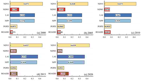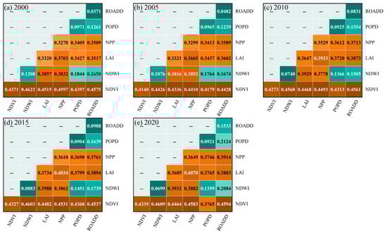 Notably, the interactional effects of factors surpassed those of their individual counterparts, demonstrating a bifold augmentation modality. In terms of factor detectors, over the past two decades, NDVI has exhibited the highest explanatory power, characterized by an initial decline followed by an increase. In contrast, NDWI and road network density showed the weakest explanatory power. NDWI followed a pattern of initial decline, subsequent increase, and final decline, whereas road network density demonstrated a consistently increasing trend. LAI and NPP displayed comparable explanatory power; the former showed an initial increase followed by a decrease, while the latter exhibited a persistent upward trend. Meanwhile, population density remained relatively stable, consistently around 0.09 (Figure 10). This thematic progression reflected the preponderance of grassland as the dominant land utilization category across the Tibetan Plateau, distinguished by copious vegetative coverage. Consequently, NDVI adeptly delineated growth status, with elevated indices indicative of optimal vegetative vitality and heightened carbon accumulation, thereby correlating with elevated carbon storage. In terms of interaction detectors, over the past two decades, the interaction between NDVI and NDWI has demonstrated the highest strength. In contrast, the interactions between population density and road network density were the weakest in 2000 and 2005, while those between NDWI and population density were the weakest in 2010, 2015, and 2020 (Figure 11). This could be attributed to the relatively humid climate and high annual rainfall found on the Tibetan Plateau, which encouraged dense vegetation to grow. Under the premise that NDVI held the strongest explanatory power, the interaction between NDVI and NDWI emerged as a more effective driving force for the region. However, the inherent explanatory power of NDWI, population density, and road network density was relatively low, generally below 0.1. Consequently, aside from NDVI, the interactions of other factors with these indices were not markedly significant. In summation, NDVI emerged as the quintessential driving force underlying carbon storage dynamics in the Tibetan Plateau, advocating for intensified ecological conservation and amelioration endeavors within the region.
