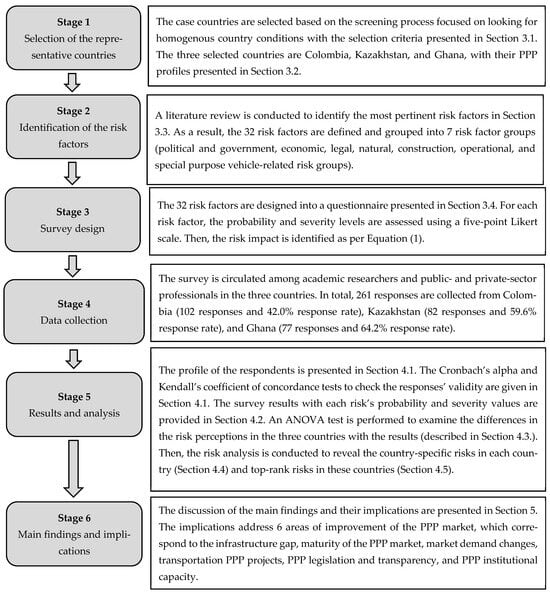 We employed a mixed methods research approach using qualitative and quantitative data and methods. The approach was based on case study and statistical methods research [40,41]. On the one hand, it involved an in-depth qualitative analysis of PPP markets and narrowed it down to the selected case countries. Conversely, the study emphasized the breadth of the research findings and performed a statistical analysis of the survey results. Figure 1 presents the scope of the methodology in 6 stages with their descriptions, which are presented in the following sections.
