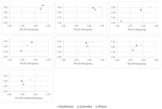 In terms of risk probability, the highest mean risk probability is in Kazakhstan (3.29), while in Colombia and Ghana it is lower (3.10 and 3.03, respectively) (Table 4). This disparity implies that PPP practitioners in Kazakhstan perceive a consistently higher risk level than their counterparts in the remaining countries. The heightened risk perception in Kazakhstan may be due to the specific risk factors within the economic (EC1—absence of competition), legal (LG1—legislation changes), and SPV-related (SP2—inexperienced private partner) groups. Interestingly, the probability assessed for these risk factors was much less significant in Colombia and Ghana. Generally, developing countries with less mature PPP programs, such as Kazakhstan, are characterized by lower overall investment and tend to display greater risk aversion.