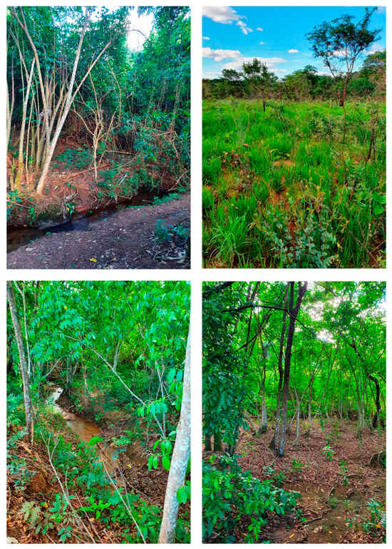Due to its proximity to the preserved spring areas of Olhos d’Água Park and Lake Paranoá, the preservation and conservation of the Arboretum are essential. This is due to the presence of watercourses, groundwater outcrops, and springs, as well as riparian forests that protect the margins of the water sources that flow into Lake Paranoá [18]. The vegetation cover of the Arboretum consists mainly of native species of the cerrado biome, forming a mosaic of vegetation that includes different types of forests, savannas, and grasslands. Stretches of gallery forest, riparian forest, cerrado stricto sensu, and campo sujo can be found. Due to its proximity to Lake Paranoá, the microclimate in the Darcy Ribeiro University Campus area is favored. The lake narrows in this stretch, extending until it reaches a small spring basin that also runs through the Olhos d’Água Park and the Arboretum. The following pictures show different sections of the Arboretum (Figure 2).