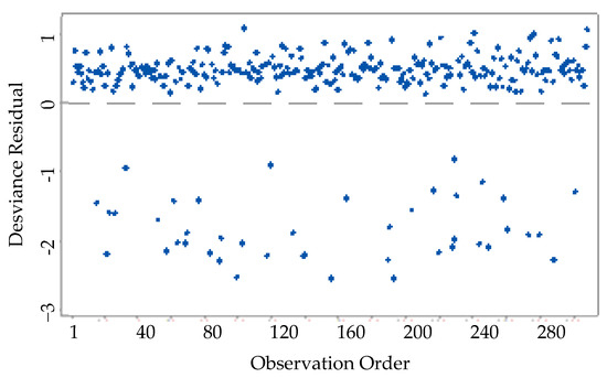 In accordance with the suggestion of Hair et al. [25] for the econometric evaluation of the model, the graph of the residuals was presented, minimizing problems of heteroscedasticity, specification, and autocorrelation, according to the randomness of the scatter plot of the unstandardized residuals. However, as per Gujarati [27], checking the dispersion of the regression residuals provides an important diagnosis of econometric problems such as heteroscedasticity, autocorrelation, and model specification. Therefore, a visual analysis of the residual dispersion was conducted.