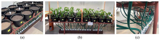 (a) Test samples arranged for experimentation. (b) Plant development stage. (c) The experimental setup for leached-out water collection.