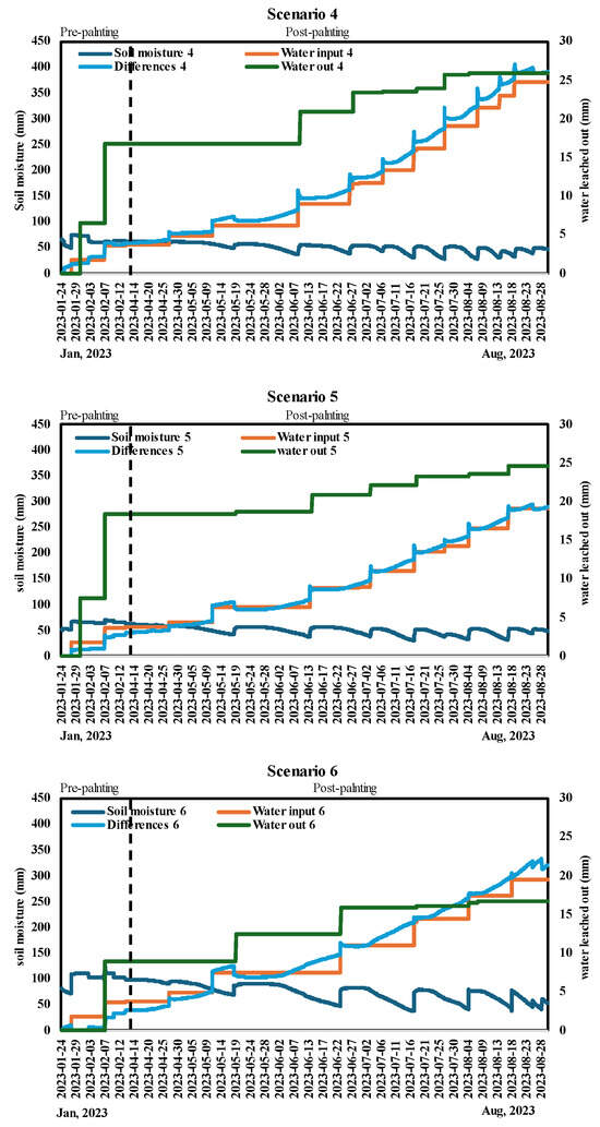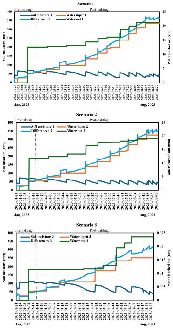 The total water input during the post-planting phase for each scenario was as follows: Scenario 1: 15.46 L; Scenario 2: 15 L; Scenario 3: 10.89 L; Scenario 4: 15.99 L; Scenario 5: 12.73 L; Scenario 6: 11.34 L; Scenario 7: 14.07 L; Scenario 8: 12.34 L; and Scenario 9: 16.37 L. All the buckets within the same group in each experiment received identical watering. Afterwards, the leached-out water from each bucket was collected and quantified to ensure precise volume measurements. During the experiment, a data logger (GP2 Data Logger, Delta-T devices, Cambridge, UK) connected to soil moisture probes (ML3 ThetaProbe, Delta-T devices, Cambridge, UK) was implemented to quantify and monitor the soil moisture content. Therefore, each of the nine scenarios featured a soil moisture data logger integrated with soil moisture probes, with the rod ends vertically positioned at a depth of 15 cm. This setup allowed us to determine the average moisture content in both the upper and lower layers of the root zone, at between 1/3 and 3/4 of the bucket’s depth.