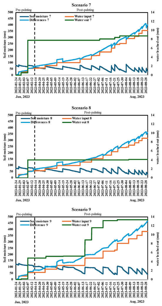 In experiment E3, the differences in soil moisture were statistically significant (p < 0.050) among all the scenarios. Moreover, introducing biochar amendments alongside air NBSW in scenario 9 substantially increased the soil moisture content. Scenario 7 exhibited the lowest moisture range (21.2–85.8 mm) and retention (13.54%), with a high leaching ratio (2.4%). Scenario 8 showed a slightly higher moisture range (23.4–88.8 mm) and retention (15.61%) and a lower leaching ratio (2.0%). Scenario 9 demonstrated the most significant effect, with the highest moisture range (40.1–128.1 mm) and retention (19.37%), while achieving a high leaching ratio (3.9%). The changes in soil moisture across the three scenarios in experiment E3 are shown in Figure 4.