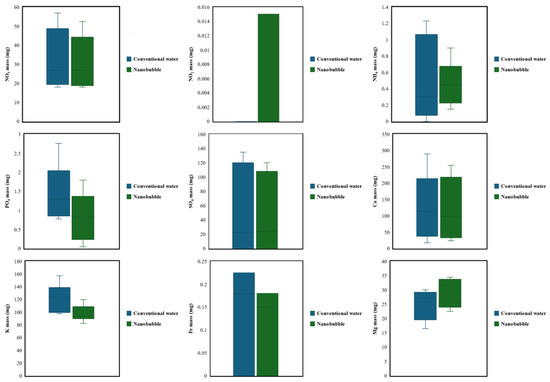Investigation of the input water quality revealed no significant differences in pH or TDS nor the amounts of NO3−, NO2−, PO43−, SO42−, Ca2+, total Fe3+, or Mg2+ between the conventional and air NBSW treatments. However, the amount of K+ showed a statistically significant difference (p < 0.050), with conventional water, displaying 25% higher amounts compared to NBSW. The absence of differences in these parameters allowed us to assume that the inflow water conditions were mostly alike. During the entire study period, the pH values ranged from 6.8 to 7.4 in both conventional water and NBSW. Meanwhile, the amount of NO3− displayed some variation in both conventional water and NBSW, ranging from 18 to 57 mg (12–38 mg/L) and 18 to 53 mg (12–35 mg/L), respectively. Similarly, the amount of PO43− ranged between 0.8 and 2.8 mg (0.5–1.8 mg/L) in conventional water and 0 and 1.8 mg (0–1.2 mg/L) in NBSW. Conventional water showed a broader range for Ca2+, with values between 18 and 290 mg (12–193 mg/L), while NBSW demonstrated variation within a range of 24 to 255 mg (16–170 mg/L). Likewise, Mg2+ varied between 16.5 and 30 mg (11–20 mg/L) and between 22.5 and 34.5 mg (15–23 mg/L). Figure 5 illustrates the range of each substance’s amount in both the conventional water and NBSW.