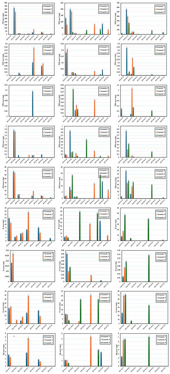 The amount of PO43− in experiment E1 ranged from 0 to 1.7 mg (0 to 2.7 mg/L) and from 0 to 1.9 mg (0 to 2.8 mg/L) and was around zero in scenarios 1, 2, and 3. In experiment E2, it ranged from 0 to 0.85 mg (0 to 1.5 mg/L), from 0 to 0.2 mg (0 to 2.5 mg/L), and from 0.5 to 0.8 mg (0.3 to 2.9 mg/L) in scenarios 4, 5, and 6, respectively, and in experiment E3, it ranged from 0 to 0.84 mg (0 to 2.1 mg/L), from 0 to 0.2 mg (0 to 1 mg/L), and from 0 to 0.4 mg (0 to 1.7 mg/L) in scenarios 7, 8, and 9, respectively. The differences in PO43− among the scenarios in all three experiments were also statistically insignificant.