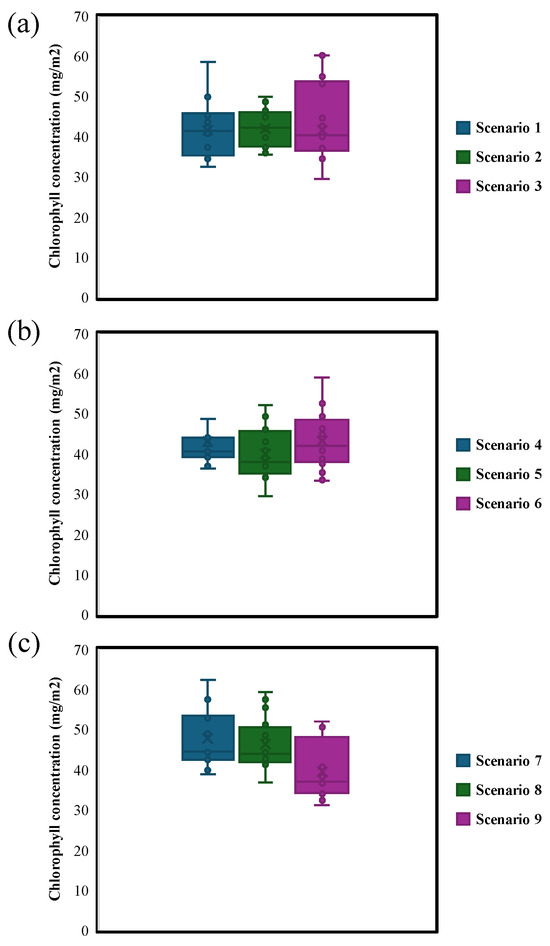 Comparison of chlorophyll concentration in California pepper plants in scenarios E1 (a), E2 (b), and E3 (c) (Each boxplot displays the interquartile range from the first quartile (Q1) to the third quartile (Q3), with whiskers extending to the smallest and largest values. The means are indicated by crosses and medians by horizontal lines within the boxes.).