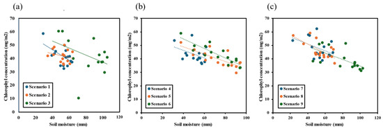 Experiment E1 showed total chlorophyll concentrations of 0.02 to 0.05 mg/cm2 (Figure 7a). In experiment E2, it ranged from 0.02 to 0.05 mg/cm2, respectively. In experiments E1 and E2, no significant differences were observed among the scenarios. In experiment E3, the chlorophyll concentration varied from 0.02 to 0.05 mg/cm2. According to the Kruskal–Wallis test, the results imply a significant reduction (p < 0.050) in scenario 9 compared to scenarios 7 and 8. Scenarios 7 and 8 showed 17% and 21.18% higher values than scenario 9, respectively. Further analysis of the relationship between the chlorophyll concentration measurements and the soil moisture content revealed that in silty loam soil, the chlorophyll content (Figure 7) was higher in the biochar-amended scenarios, while in sandy loam soil, scenario 9, despite having the highest soil moisture range, showed the lowest chlorophyll concentration in experiment E3. These observations revealed that a higher soil moisture content may create an array of adverse conditions that affect overall plant physiology, all of which can contribute to lower chlorophyll concentrations. The relationship between soil moisture and total chlorophyll concentration is illustrated in Figure 8.