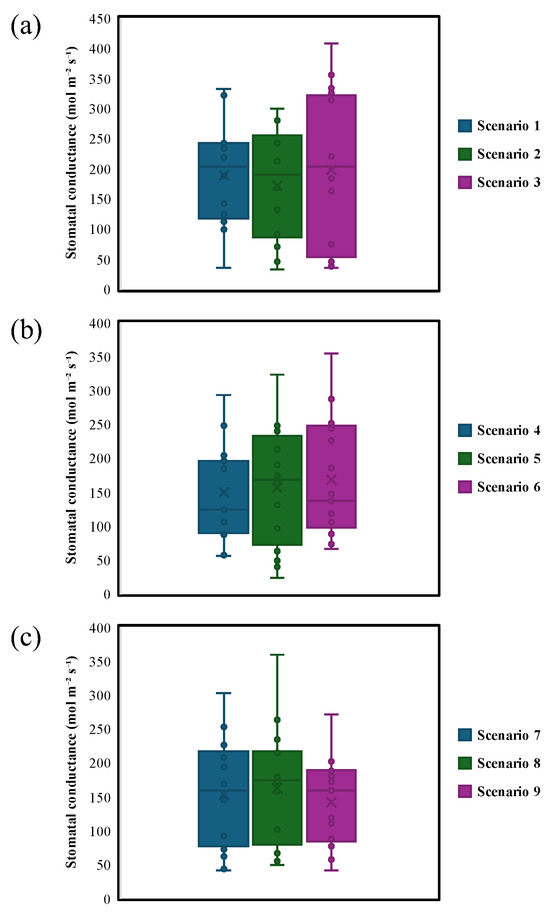 Comparison of stomatal conductance in California pepper plants across various scenarios, E1 (a), E2 (b), and E3 (c). (Each boxplot displays the interquartile range from the first quartile (Q1) to the third quartile (Q3), with whiskers extending to the smallest and largest values. The means are indicated by crosses and medians by horizontal lines within the boxes.)