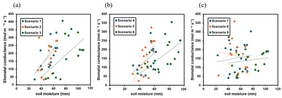 The stomatal conductance in experiment E1 ranged from 34 to 408 mol/m2/s; in experiment E2, it changed from 23.5 to 355 mol/m2/s; and in experiment E3, it varied from 42 to 359 mol/m2/s (Figure 9a–c). No significant differences among different scenarios in each of the experiments were determined. In experiment E1, air NBSW alone had an insignificant effect on stomatal conductance, but scenario 3 showed a significant increase compared to scenarios 1 and 2. In experiment E2, NBSW enhanced stomatal conductance, while scenario 6 showed further enhancement compared to scenarios 4 and 5. In experiment E3, NBSW alone resulted in the highest increase in stomatal conductance, and scenario 9 had the lowest stomatal conductance compared to scenarios 7 and 8. Further analysis revealed that in experiment E1, scenario 3 demonstrated the highest stomatal conductance. This indicates that the plant responds more effectively to a higher soil moisture content (Figure 10a). Similarly, in experiment E2, NBSW enhanced the stomatal conductance, and in scenario 6, which had a higher soil moisture content, there was a further increase in stomatal conductance compared to scenarios 4 and 5. In experiment E3, while NBSW increased stomatal conductance, scenario 9 had the lowest conductance. This finding indicates that the stomatal conductance in plants growing in consistently highly moisture-retentive soil might be lower due to potentially reduced water uptake and transpiration. The response could be caused by a temporary oxygen deficiency in the roots or a reduction in photosynthesis, protecting the plant from excess water accumulation in the tissues. The relationship between soil moisture and stomatal conductance across the scenarios are shown in Figure 10.
