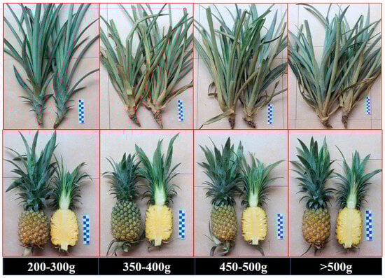 Images of pineapple shoot mass and fruit morphology for different treatments (200–300 g, 350–400 g, 450–500 g, and >500 g).