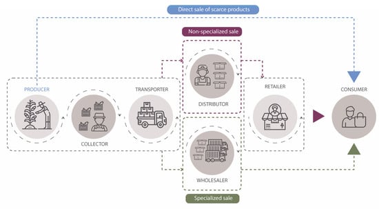 Particularly in cases of limited market development in the mountain agriculture sector, the production chain is composed of multiple intermediaries, where the marketing process involves a minimum of seven links, as shown in Figure 2, where different methods can be observed according to the type of sale where farmers are also key players within the production chain [9].