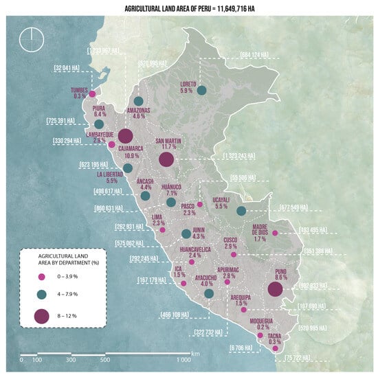 In Peru, the agricultural area covers 11,649,716 hectares, as shown in Figure 3. The Andean region has the largest agricultural area with 5,172,954 hectares, representing 46% of the national land dedicated to crop production. The Ancash region has 498,617 hectares of agricultural land, which represents 4.4% of the total national area, with 165,971 producers classified within family agriculture. The statistical information available on the agricultural sector is based on the last Agricultural Census of 2012, which was carried out with the support of international organizations such as the FAO [13].