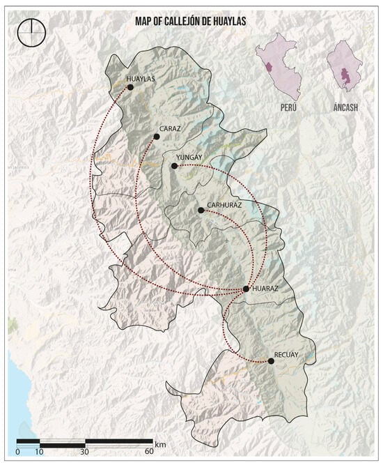 The main regional center in Ancash is Huaraz City, which holds the status of a major city, according to the SICCEP. This city serves as the primary driver of the regional urban system, acting as a hub for various commercial, tourist, and administrative activities [18] (Figure 4).