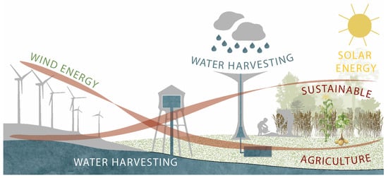 In Figure 5, various schemes illustrate different ways to efficiently use natural resources. Some of the capture strategies presented include water harvesting, wind energy capture, and river water capture. Given that the global landscape is evolving and past achievements may not guarantee future advancements, climate change represents a significant challenge in the current era. It is recognized that sustainable agriculture requires more efficient management of natural resources to produce more with less, especially in the face of increasingly extreme weather conditions and heightened competition for resources [19].