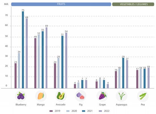 During the first semester of 2023, agro-exportation in the region experienced a 7% increase, driven by the rise in sales of blueberries (+40%), avocados (+21%), and asparagus (+25%) [15].