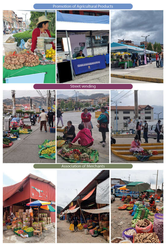 Due to the lack of regular agricultural commercialization, informal street vending by agricultural producer associations occurs in the city, where they appropriate a space to sell their products (Figure 7). This is because the government is ineffective in guaranteeing and ensuring formal sales, leading to informal vending. Despite the inconvenience of occupying inadequate spaces, these vendors have customers who, despite the discomfort, see this activity as their primary purchasing option [27,28].