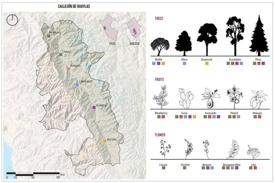 Naturalist Antonio Raimondi was among the first to observe and study the flora in Ancash. In 1860, he visited the Callejón de Huaylas and Conchucos, laying the groundwork for floristic inventories that have been updated over the years. The climate in the Callejón de Huaylas region allows for a diverse array of flora, with various specimens thriving due to the microclimates present in the mountain range, (Figure 11) provides a classification of trees (such as molle, aliso, quenual, eucalyptus, and pine), fruit (including blueberry, prickly pear, avocado, peach, and mango), and flowers (such as lluvia, orchids, retama, bougainvillea, and lilies). These species are distributed throughout the Callejón de Huaylas [33].