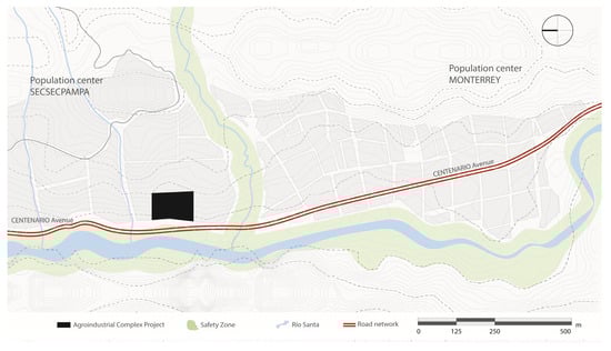 Figure 12 highlights the location of the terrain in the Monterrey Community, which is considered a strategic point. To the south, it has a direct connection to the urban center of Huaraz City via Centenario Avenue, while on the other side, it connects to the agricultural areas of the region (Caraz, Carhuaz, and Yungay). This strategic location, influenced by the dynamic center of Huaraz City, benefits the integration between small producers from the Callejón de Huaylas and consumers.