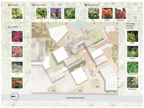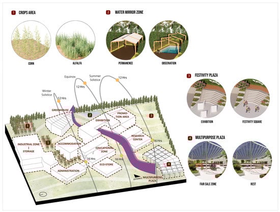 In Figure 16, the projected productive plantations within the agro-industrial complex can be identified, considering the classification of each product that is part of the main routes, exhibition spaces, and education areas.