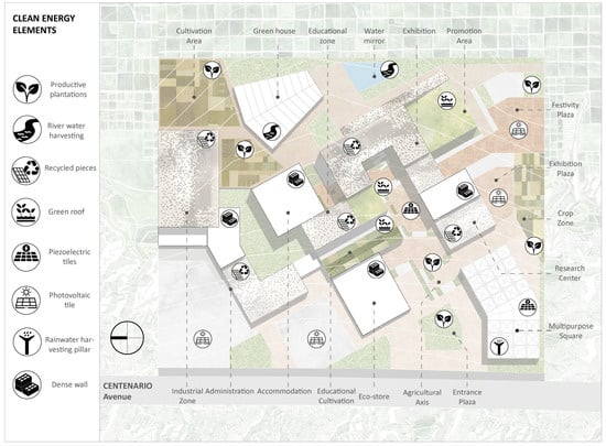 Figure 15 illustrates the elements proposed as strategies for clean or renewable energy design. These elements integrate various productive plantations, which are part of the green areas within the project. Other strategies outlined in the project include the harvesting of natural elements such as water and solar energy, along with the reuse of recyclable materials. Together, they form part of sustainable design strategies.