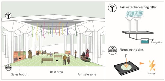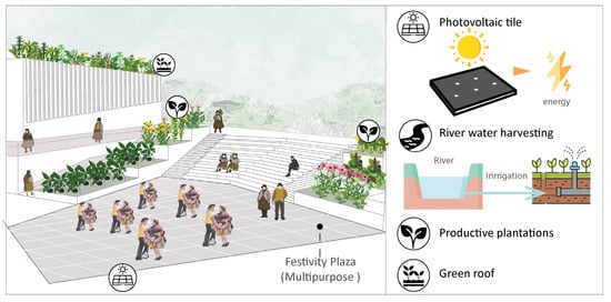 The integration into a formal market at the local level with fewer economic gaps and limitations and commercial intermediaries is introduced with a collection center as part of the project program, similar to the case of Plaza de Mercado Gramalote in Colombia. This center allows small producers to join in a centralized collection point, which has resulted in reduced agricultural product losses and better organization among local producers. Additionally, the project incorporates rainwater collection systems for crop irrigation, thus promoting the project’s energy efficiency [48].
