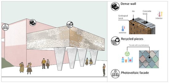 Figure 19 shows the facade design, which is composed of two systems: the first one is based on a structured skin system made from recycled organic elements, creating a closed system that can be installed in both existing buildings and new architectural projects [42]. The second one is a photovoltaic system. This design consists of modules integrating photovoltaic glass and electronic systems for operation. The energy-generating windows are made with glass sheets of various thicknesses ranging from 3 to 19 mm. In addition to their primary function of generating clean electricity through photovoltaic glass or a luminescent solar concentrator, these windows can be adjusted to improve sound insulation, providing greater acoustic insulation [43]. Given the wide variation in temperatures between day and night, considering a construction system with high thermal inertia is a sustainable strategy, as it corrects and moderates extreme temperatures. The density of the walls allows for storing energy to stabilize indoor temperatures, thereby reducing fluctuations [44].
