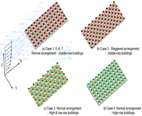 The details of the boundary conditions can be found in Table 2. The mean diffusion field was analyzed by assuming the gravitational settling velocity of pollutant transport to be “0”, that is, by uniformly generating pollutants assumed as passive contaminants with no inertia within the area. Since the building coverage ratio is the same in Cases 1 to 3, a constant value of 1.0 μg/m3 sec per unit volume was given to the concentration development rate in the space from the ground to a height of 0.5 H as a condition for pollutant generation. However, since Case 4 has a lower building coverage ratio than the other cases, the condition for concentration development of 0.899 μg/m3 sec per unit volume was given, and conditions for pollutant generation per household area were set identical to those in the other cases. Furthermore, the details of the boundary conditions for temperature can be found in Table 2 and the surface temperature and bulk Richardson number (Rb) for each case regarding atmospheric stability can be found in Table 3.
