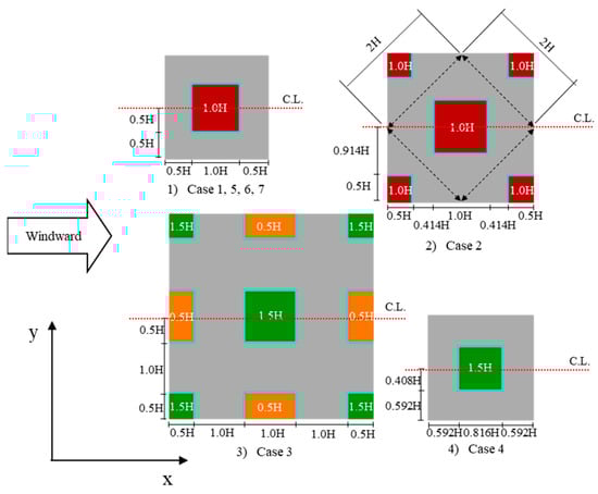 Figure 2 and Table 1 present target areas per case for the CFD analysis and their details. In all cases, we set the maximum height of the upper layer from the ground to about 6.67 H (1.0 H = 15 m), and 1.0 H was set as the basis for one side of a building. Case 1 is the reference case with an arrangement of middle-rise buildings (X(1.0 H) × Y(1.0 H) × Z(1.0 H)) in a normal grid pattern. Case 2 has middle-rise buildings in a staggered pattern. Case 3 has low-rise buildings (1.0 H × 1.0 H × 0.5 H) and high-rise buildings (1.0 H × 1.0 H × 1.5 H) in a normal grid pattern. Case 4 has the same target areas and building arrangement as Case 1. However, the building coverage ratio was adjusted to a smaller scale to give the same floor area ratio as other cases (Table 1). Only Case 1 was considered for the atmospheric stability analysis, and Case 1 was considered neutral, Case 5 slightly stable, Case 6 weakly unstable, and Case 7 unstable. The mesh split of the analysis model can be found in Table 1. Figure 3 shows the conditions and characteristics of canyon space contaminants.