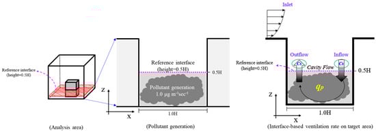 where, in Equation (1), the numerator of the right side refers to the rate of pollutant generation and the denominator indicates the area-averaged concentration of the interface in the target area, q is the rate of pollutant generation per unit volume (μg/m3 s), C is the pollutant concentration (μg/m3), qp refers to the rate of pollutant generation within the target area per unit time (μg/s), and CP is the spatial average concentration of the target area p (μg/m3).