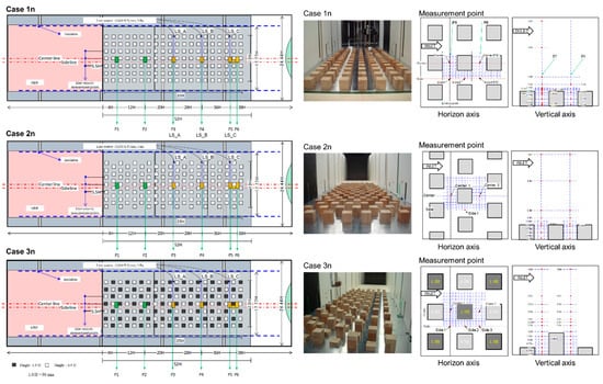 The wind tunnel experiment is primarily utilized to measure and analyze the flow field and diffusion field within the street canyon space. By comparing the wind tunnel experiment with CFD analysis to validate the prediction accuracy of CFD analysis, it is deemed suitable to utilize CFD analysis for a detailed analysis of the ventilation throughout the entire space. In this wind tunnel experiment, several buildings were positioned in the main direction to facilitate the development of the urban boundary layer within the measurement area. Figure 4 shows the wind tunnel experiment conditions and characteristics of canyon space contaminants. The experiment was conducted in the boundary layer wind tunnel at the Institute of Industrial Science, University of Tokyo. The test section measured 1.8 m in height, 2.2 m in width, and 16.47 m in length. The anemometer used an X-shaped probe (Model 55P61) and an SFP probe (Model 55R55) anemometer (DANTEC, Skovlunde, Denmark). The data were averaged over 60 s then analyzed. In the case of the X-type anemometer, reliability issues may arise if it fails to measure the prevailing wind accurately, leading to errors in the measurements. The SFP probe, on the other hand, was utilized to measure the backdrafts occurring in the canyon space. Wind tunnel experiments were carried out for Case 1, Case 2, and Case 3, as depicted in Figure 2, featuring different building model configurations. The wind speed the inlet was measured 5.5 H upstream from the far end of the measurement area, with y = 0 (center), y = −180 mm (side), and y = 180 mm (side). HR represents the reference height (R = 900 mm), and the wind speed at the location corresponding to the reference height is the reference wind speed (uR). Measured wind speed was uR = 1.87 m/s. The RMSE analysis method was used to assess the reliability of the measured and simulated data. The formula used to calculate the root mean square error (RMSE) between measured and calculated data is shown in Equation (3).