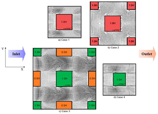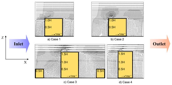 Figure 6 presents the vectors of wind velocity on a horizontal plane at the pedestrian level (height 0.1 H) in the canyon space of Cases 1–4. Figure 7 indicates a vertical cross-section of the mean wind velocity vector created based on CL (center line; Figure 2) for the results of Cases 1–4.