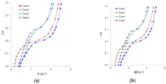 Figure 6 shows the results of the average wind velocity vector in the horizontal plane under isothermal calculation conditions at the pedestrian level (heigh 0.1 H) within the target area. Figure 7 indicates a vertical cross-section of the target area plane based on the center line of the plane (CL; Figure 2). Figure 8 and Figure 9 indicate the mean vertical profile of the horizontal plane regarding the mean wind velocity U1 and the absolute value of the mean wind velocity (Equation (3)) for isothermal and nonisothermal cases.
