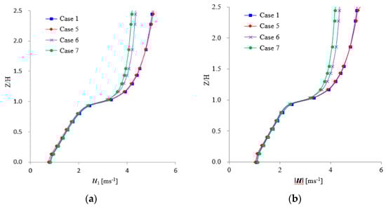 Figure 8 indicates the vertical profiles of the mean values on a horizontal plane for Cases 1–4. In the section below the height of 1.0 H, Case 1 has the highest wind velocity, while Case 2 has the lowest, except near the surface. Case 3 has a higher wind velocity than Case 4. In the section above the height of 1.0 H, Case 1 has the highest wind velocity, followed by Case 2. Although this study did not indicate this tendency, it continuously appeared in the analysis domain. In Case 2, the wind velocity is inhibited in the section below a height of approximately 1.0 H due to the staggered building arrangement, and becomes lower; however, the wind velocity reduction effect in the air is found to be huge in Cases 3 and 4. In Case 3, with different building heights, the wind velocity near the ground surface is higher than in Case 1. The reason is that the wind with relatively high velocity passed over low-rise buildings and then hit the high-rise buildings, blowing them downward while simultaneously splitting to the left and right, and sweeping the wind near the ground (Case 3 has a low wind velocity between buildings; however, the wind velocity on the road in the mainstream direction was larger than Case 1. Thus, the scalar wind velocity of the entire horizontal plane is assumed to be high in Case 3 (see Figure A1 in Appendix A)). However, in the section above the height of 1.0 H, Case 3 has a lower wind velocity than Case 2, and the difference in wind velocity becomes smaller among all the cases. As for Case 4, the wind velocity becomes the lowest at a height of approximately 1.5 H or higher. This is due to the large area of high-rise buildings in Case 4, resulting in the larger resistance of the building to the air current flow, leading to lower wind velocity. As a result, from the perspective of wind ventilation at the pedestrian level within a city, it can be assumed that a staggered arrangement of medium-rise buildings or a normal grid arrangement of high-rise buildings is disadvantageous compared to a normal grid arrangement of medium-rise buildings and different building heights if the same group of buildings is a continuous wind field. Figure 9 indicates the wind velocity of Case 1 and Cases 5–7, considering atmospheric stability. There is no significant difference in the section below the height of 1.0 H per case; however, in the section below the height of approximately 0.4 H, Case 7 (unstable) has a slightly higher wind velocity than Case 1, whereas Case 6 (weakly unstable) has a slightly lower wind velocity.