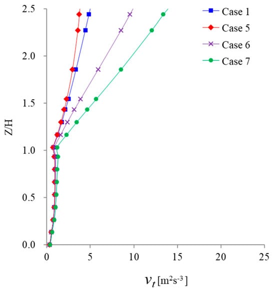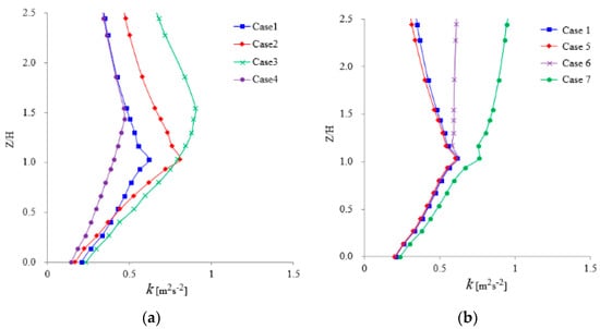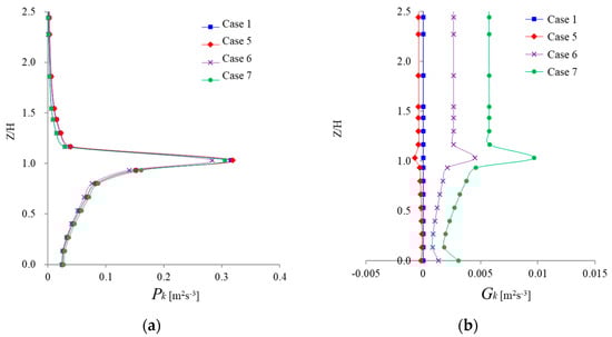 The vertical profile of the average turbulence energy k on a horizontal plane of the isothermal calculations (Cases 1–4) in Figure 10a presents that Cases 1–3 showed slight differences in the section below the height of approximately 0.5 H, and Case 4 had the smallest value. In the section above the height of around 0.5 H, Case 3 had the largest value. Case 2 had a smaller value than Case 1 in the section below the height of 0.5 H, yet a larger value than Case 1 above the height. The results of the calculation, considering atmospheric stability (Case 1, Cases 5–7), in Figure 10b indicate that Cases 1, 5, and 6 had almost identical values, and Case 7 had the larger value in the section below the height of 1.0 H. Cases 6 and 7 had larger values in the section above the height of 1.0 H. Furthermore, as the height increases, the production term Pk (Figure 11a) of k, due to the mean flow, approaches “zero” with a wind field similar to a free shear flow. In the case of atmospheric instability, since there is the production term Gk (Figure 11b) of turbulence energy due to buoyancy, the turbulence energy k of Case 7 became larger. This explains why the coefficient of virtual viscosity νt in Figure 12 is larger on the unstable side in Cases 6 and 7. As for atmospheric stability, it is assumed that the turbulence energy k becomes smaller due to the negative Gk, and, consequently, the coefficient of virtual viscosity νt becomes smaller. In Section 5.1, atmospheric stability was considered ineffective in wind ventilation at a pedestrian level; however, considering the characteristics of turbulence energy, atmospheric instability is considered to impact the diffusion of pollutants into the air.