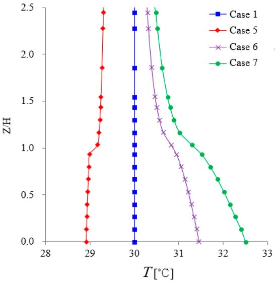 Figure 13 shows the vertical profile of the horizontal plane mean temperature with respect to CL for the cases considering atmospheric stability. Compared to Case 1 (neutral), Case 5 (stable) shows a positive temperature gradient from the surface to the upper atmosphere, while Case 6 (weakly unstable) and Case 7 (unstable) show a negative temperature gradient between the surface and the upper atmosphere. Case 7 shows a large gradient in the canyon space. This can be thought of as a function of the magnitude of the temperature difference between the surface and the air, depending on the atmospheric stability.