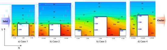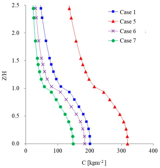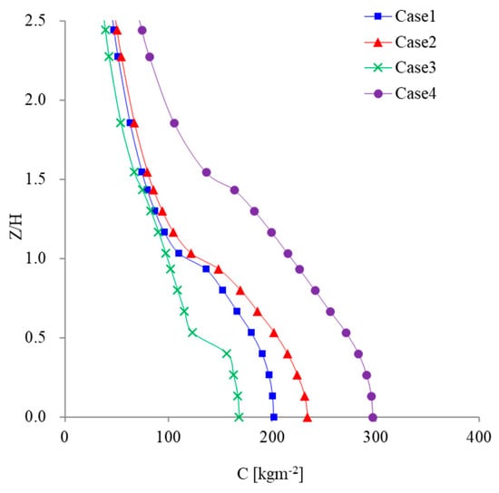 Figure 16 presents the vertical profile of the mean concentration (C) on a horizontal plane in the isothermal calculation. In the section below the height of 1.0 H, Case 3 shows a low concentration, whereas Case 4 shows the highest concentration. Furthermore, in the section above the height of 1.0 H, Case 3’s concentration becomes the lowest, whereas Cases 1 and 2 have no significant difference. However, the concentration of Case 4 became higher than the other cases. If the result is compared with the results of turbulence energy k in Figure 7a, Case 4 has a smaller turbulence energy k, yet a higher concentration. Meanwhile, in Case 3, the turbulence energy k became larger; however, the concentration became lower. As mentioned earlier, the scale of turbulence energy k has a huge impact on concentration diffusion. Such findings are contradictory when compared to the results of wind velocity (the concentration is low even though the wind velocity in the air becomes lower (Figure 8)). If a constant value is given to the pressure gradient at the inflow–outflow boundary, and the magnitude of this pressure gradient is set to the same value for all cases as in this study, Case 3’s value becomes the smallest in terms of the average wind velocity in the air due to the higher building drag.