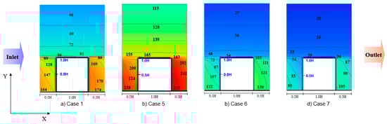 Figure A1 shows the horizontal plane distribution of pollutant concentrations at the pedestrian level for reference. Based on the characteristics of the horizontal plane distribution, it can be seen that Case 3 has the lowest concentration and Case 4 has the highest concentration. This can be understood as the effect of turbulence energy k being more significant than the effect of wind speed, as described in Section 5.3.3.