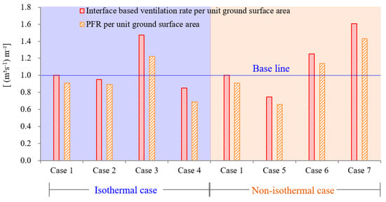Overall, we can see that the trends of the perimeter reference ventilation and PFR are very similar, but the perimeter reference ventilation per unit land area is slightly larger than the PFR per unit land area. This is because the average concentration of interface in the air above the canyon space is smaller than the average concentration in the target space within the canyon (Equations (1) and (2)). In terms of the interface-based ventilation volumes per unit surface area in the isothermal calculation, Case 2 is slightly smaller than Case 1, while Case 3 is the largest, being about 120% that of Case 1.