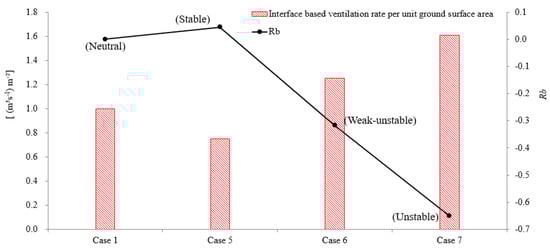The relationship between the interface-based ventilation volume and Rb in the atmospheric stability case can be found in Figure 19. It is possible to confirm the simple correlation that the more unstable the atmosphere, the greater the ventilation volume and the higher the ventilation efficiency, and vice versa.