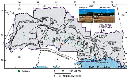 Geologic location and provincial boundaries map of the Cranfield site (circled red); inset: the field photo of one injection and two monitoring wells at the study site [10].