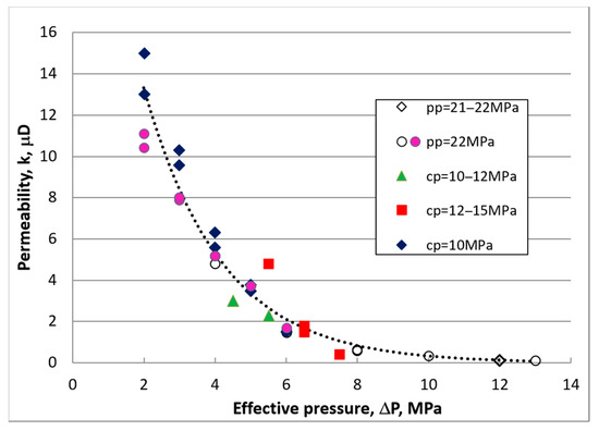 To avoid further mechanical damage, the second stage of permeability measurements (with shortened sample) was performed at relatively modest confining pressures below 24 MPa and pore pressures of up to 22 MPa. The plot summarizing all permeability measurements at various effective pressures from the combined two stages is shown in Figure 3. The effective pressure is defined per Terzaghi’s principle as a difference between the confining pressure and the pore pressure [15].