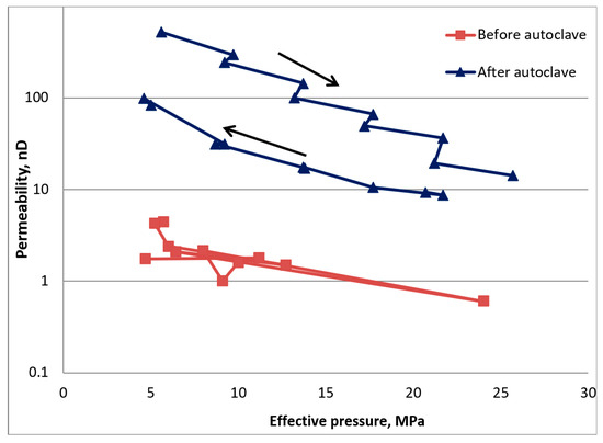 For cross-validation, these measurements were performed with three different upstream transient-pressure patterns: a step, a six-period sine wave, and a linear ramp. Permeability values were derived from the downstream pressure responses. The details are provided in Table A1. The dominant trend was decreasing permeability with increasing effective pressure, but permeability loss was irreversible (as shown in Figure 4). However, the permeability hysteresis loop was at substantially higher levels than prior to the autoclave experiments.