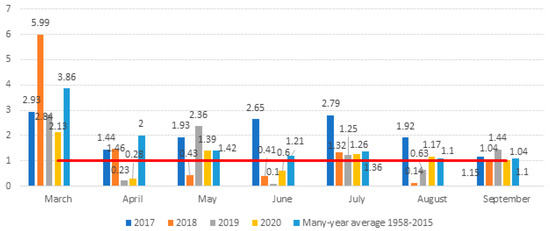 Sielianinov hydrothermal index (K) in 2017–2020 (measured at the Agro-meteorological Station in Gorzyń). Classes of weather conditions: very dry: 0.41 < k < 0.7; dry: 0.71 < k < 1.0; quite dry: 1.01 < k < 1.50; quite wet: 1.51 < k < 2.0; wet: 2.01 < k < 2.5; very wet: 2.51 < k < 3.0; and extremely wet: k > 3.01 [36].