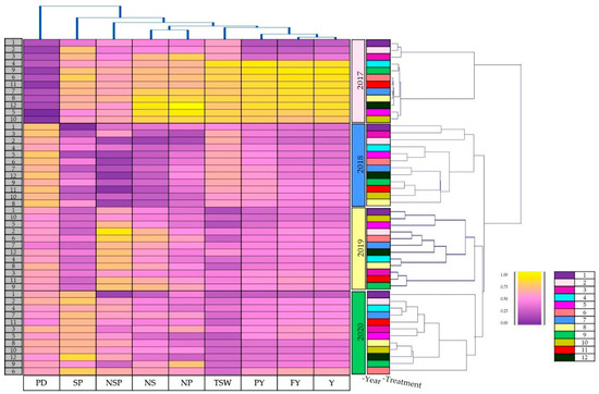 All data were processed using one-way analysis of variance (ANOVA) in four replications with the SAS package Version 7-1 [35]. The means of treatments were compared using Tukey’s Multiple Range test and declared at the p < 0.05 and p < 0.01 levels. A heat map has been used as a graphical representation of the appropriately transformed data of the biometric, qualitative, and agronomic parameters. Data transformation through ‘normalization’ was used to compare and group characteristics that had different units or scales using a standardization method (z-score normalization). Nitrogen fertilization and seed inoculation data are showed by colors (1–12). Cluster analysis was used to group both agronomic and quality parameters after treatment of nitrogen and seed inoculation, and the impact of the fertilizers/inoculant, such that the degree of association between the applied fertilizer/inoculation treatments within a group, was the highest, while the degree of association between groups was the lowest. Ward’s hierarchical clustering method and Euclidean distance measurements were used to cluster the tree diagrams.