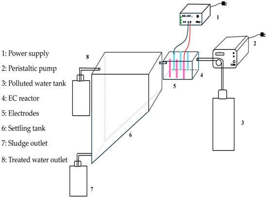 Electrocoagulation treatment has been widely studied in recent years to treat different pollutants using various types and configurations of reactors. Among these, batch and continuous reactors are prominent. In batch reactors, sacrificial electrodes are submerged in a specific volume of water, and an electric current is applied to induce coagulation and remove pollutants. This type of reactor is used for small-scale applications. It is widely used in laboratory studies and pilot-scale experiments [7,8,18,20].