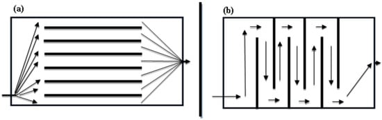 Schematic representation of (a) parallel and (b) perpendicular electrode positioning (The arrows indicate the direction of the flow of fluorinated water in the reactor).